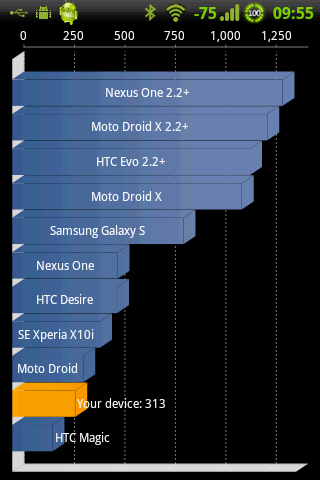 Benchmarks speak a clear language, in comparison to stock Android 1.5 with MotoBlur the new version 2.2.1 almost doubled the performance of the phone. I had like 150 to 180 points in Quadrant Standard benchmark on Android 1.5 and now I gain like 310 to 350, depending on what services are actually running and the CPU clock speed.